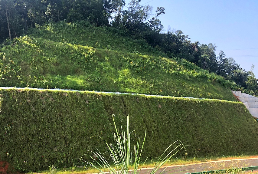 項(xiàng)目主體工作于2023年10月中旬完工。高次團(tuán)粒噴播、客土噴播、噴播植草等噴播總面積4萬(wàn)余平方米,φ32、φ25螺紋鋼錨桿總長(zhǎng)度1萬(wàn)2千余米。目前,植物生長(zhǎng)均勻、長(zhǎng)勢(shì)良好,部分野花已經(jīng)開放,在國(guó)慶中秋之際給服務(wù)區(qū)內(nèi)增添了一抹秀色,獲得了業(yè)主、監(jiān)理、業(yè)內(nèi)同行的一致好評(píng)。